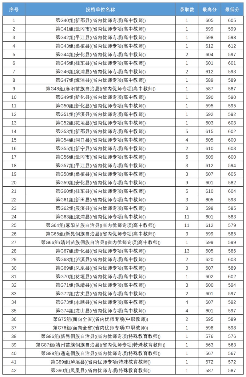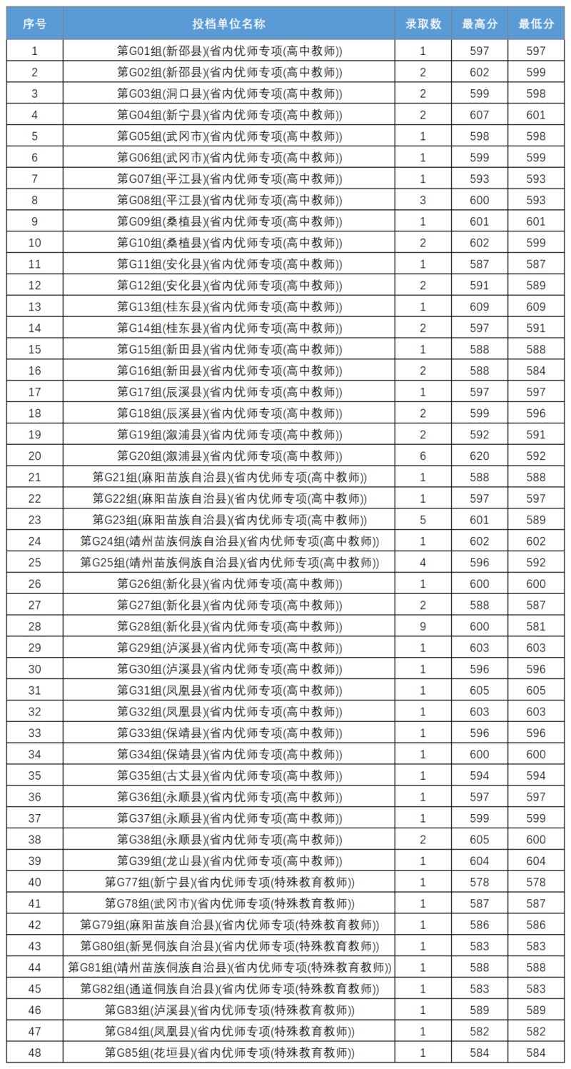 G40组新邵县高中教师最低分605,武冈市最低分599。G43组桑植县高中教师最低分612.安化县高中教师最低分597。