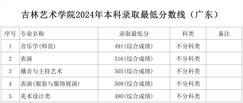 吉林艺术学院2024在广东音乐学师范最低分491,表演专业最低分516,播音与主持艺术专业最低分505.
