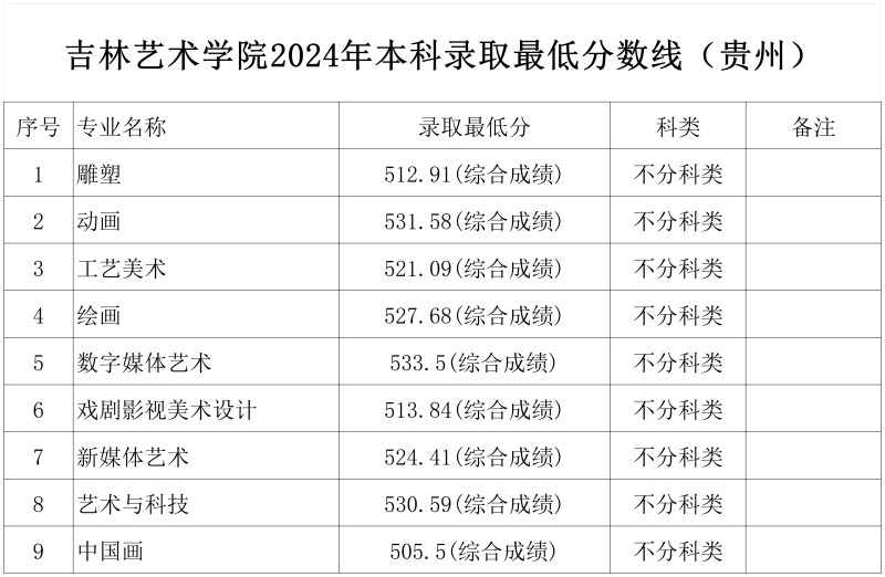 吉林艺术学院2024在贵州招生雕塑专业最低分512.91,动画专业最低分531,工艺美术最低分521,绘画最低分521。
