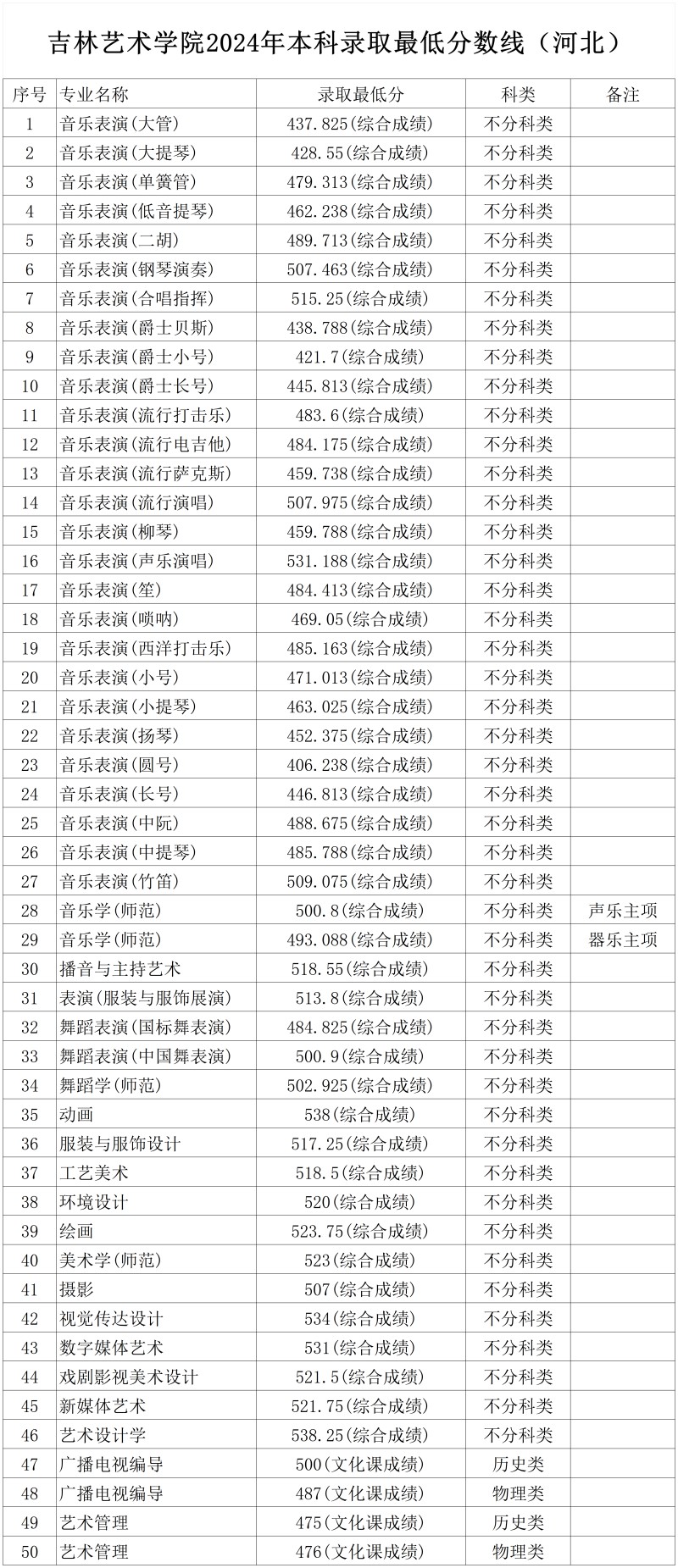 吉林艺术学院2024河北音乐表演大提琴最低分428,二胡最低分489,钢琴演奏最低分507,合唱指挥最低分515。