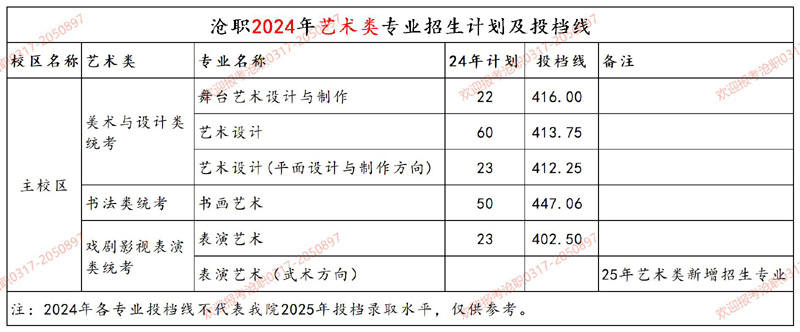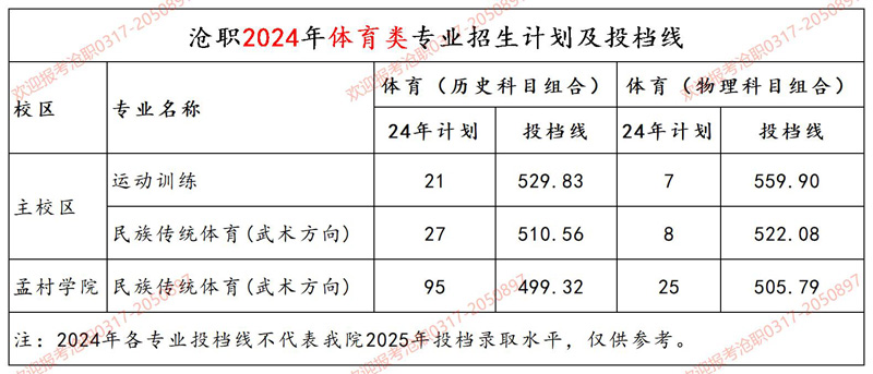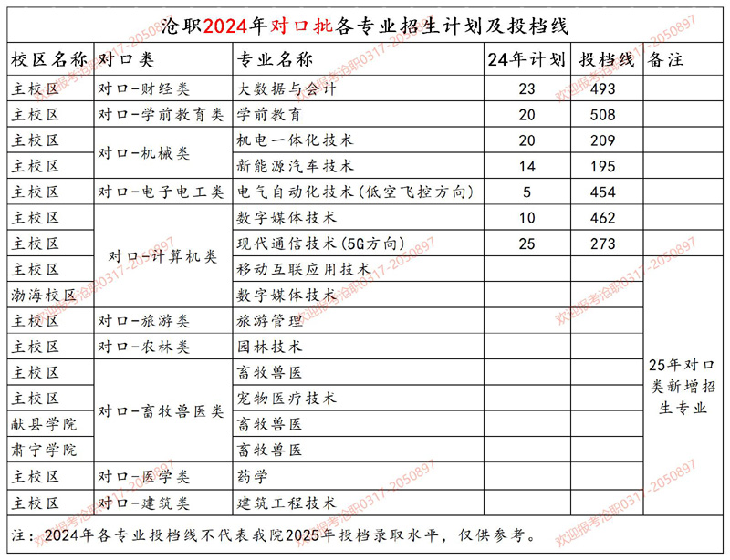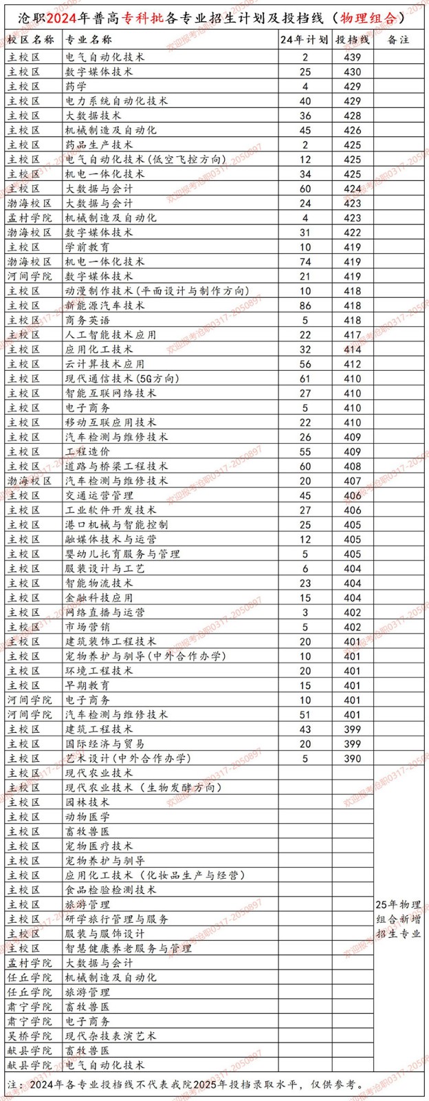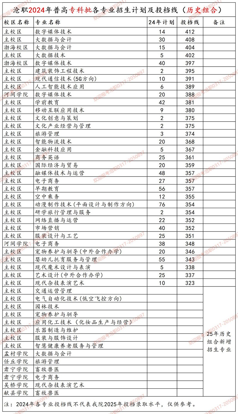 沧职2024年普高专科批各专业招生计划及投档线(历史组合)