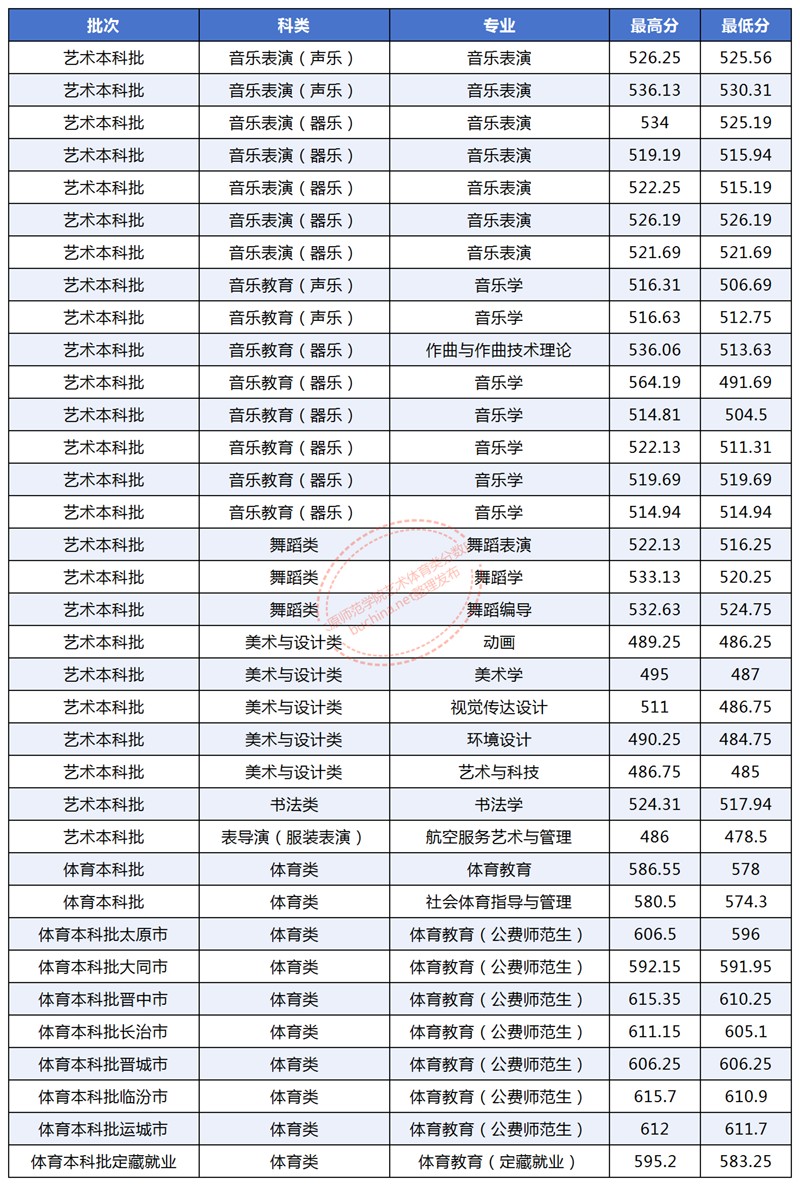 体育本科批体育类:体育教育最高分586.55,最低分578;社会体育指导与管理最高分580.5,最低分574.3。体育教育(公费师范生):太原市最高分606.5,最低分596;大同市最高分592.15,最低分591.95;晋中市最高分615.35,最低分610.25;长治市最高分611.15,最低分605.1;晋城市最高分606.25,最低分606.25;临汾市最高分615.7,最低分610.9;运城市最高分612,最低分611.7。